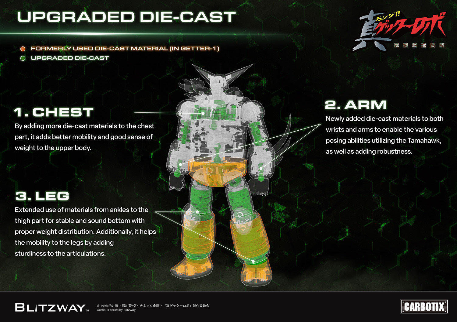 Discover Blitzway's second “Getter Robo” product in the Carbotix Line, the "Black Getter," which showcases an even more developed design, following the popularity of the previous "Getter Robo-1" series.