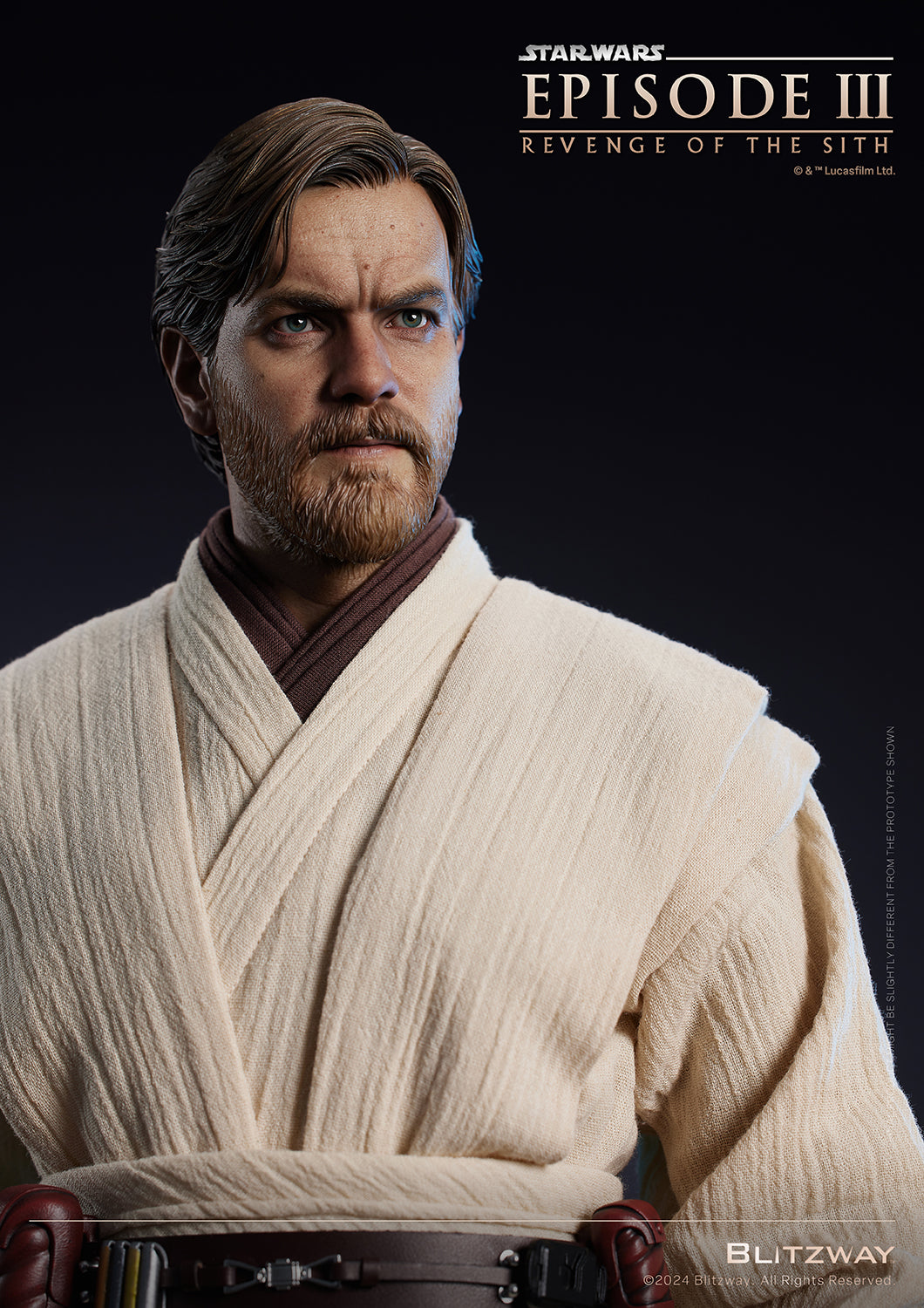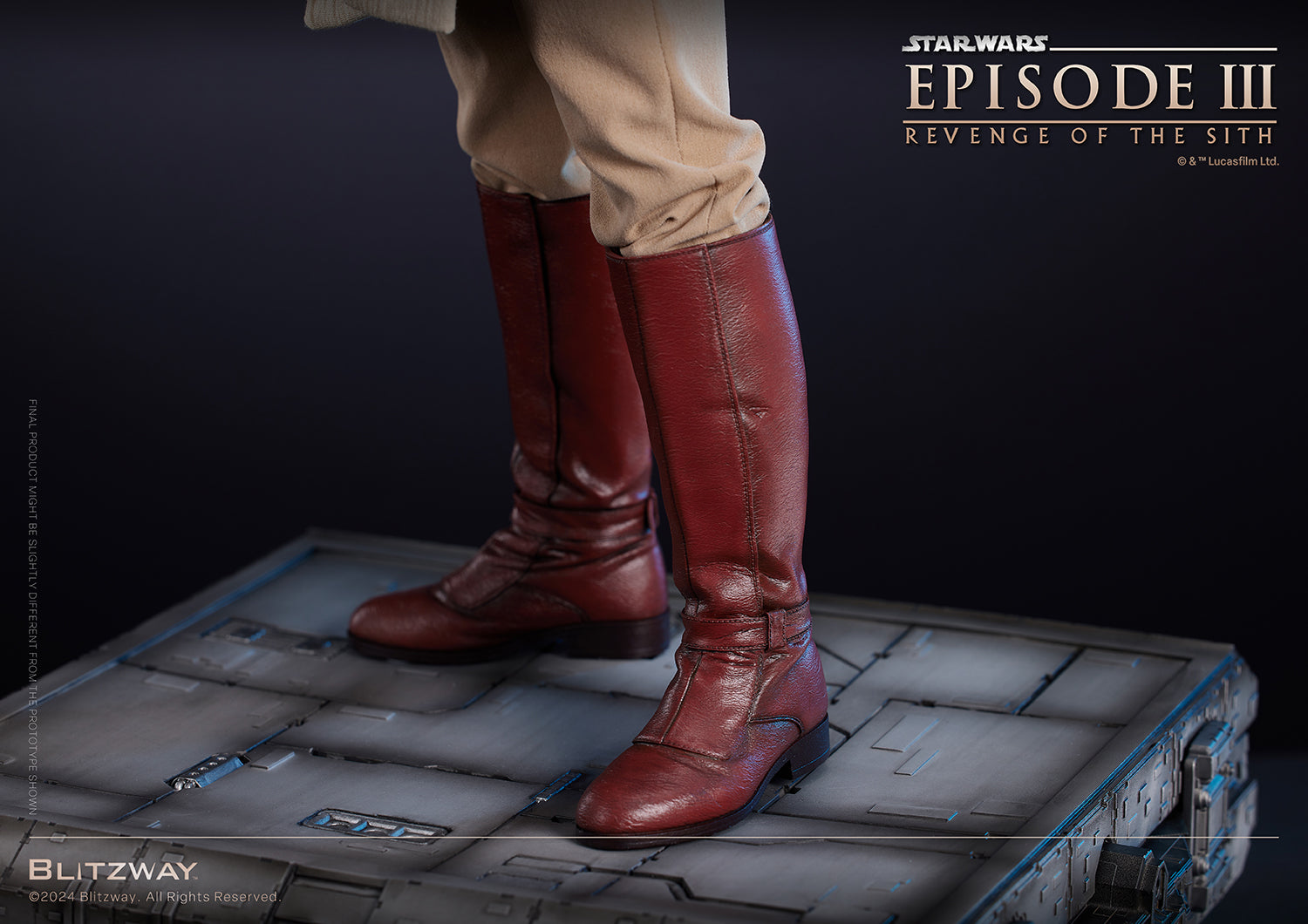 Obi-Wan, faced with the tragedy of watching his apprentice and brother, Anakin, succumb to the dark side, is portrayed with a poignant mix of sorrow and unwavering duty as a Jedi. His pose reflects this heavy emotional burden, from his sloping shoulders to his firm, grounded stance, capturing the weight and solemnity of a Jedi Master.