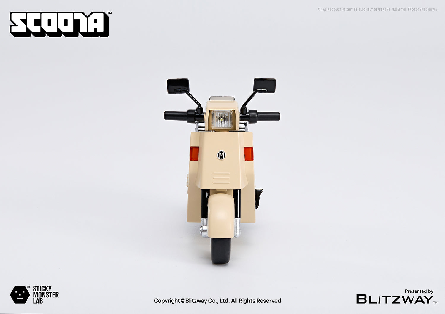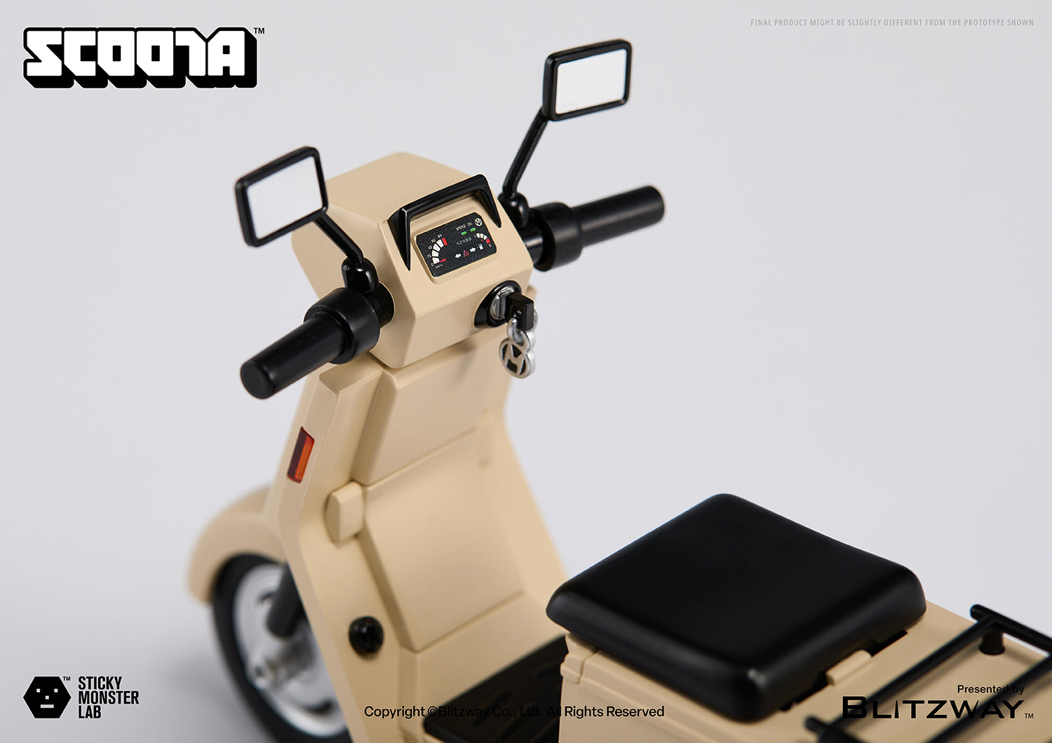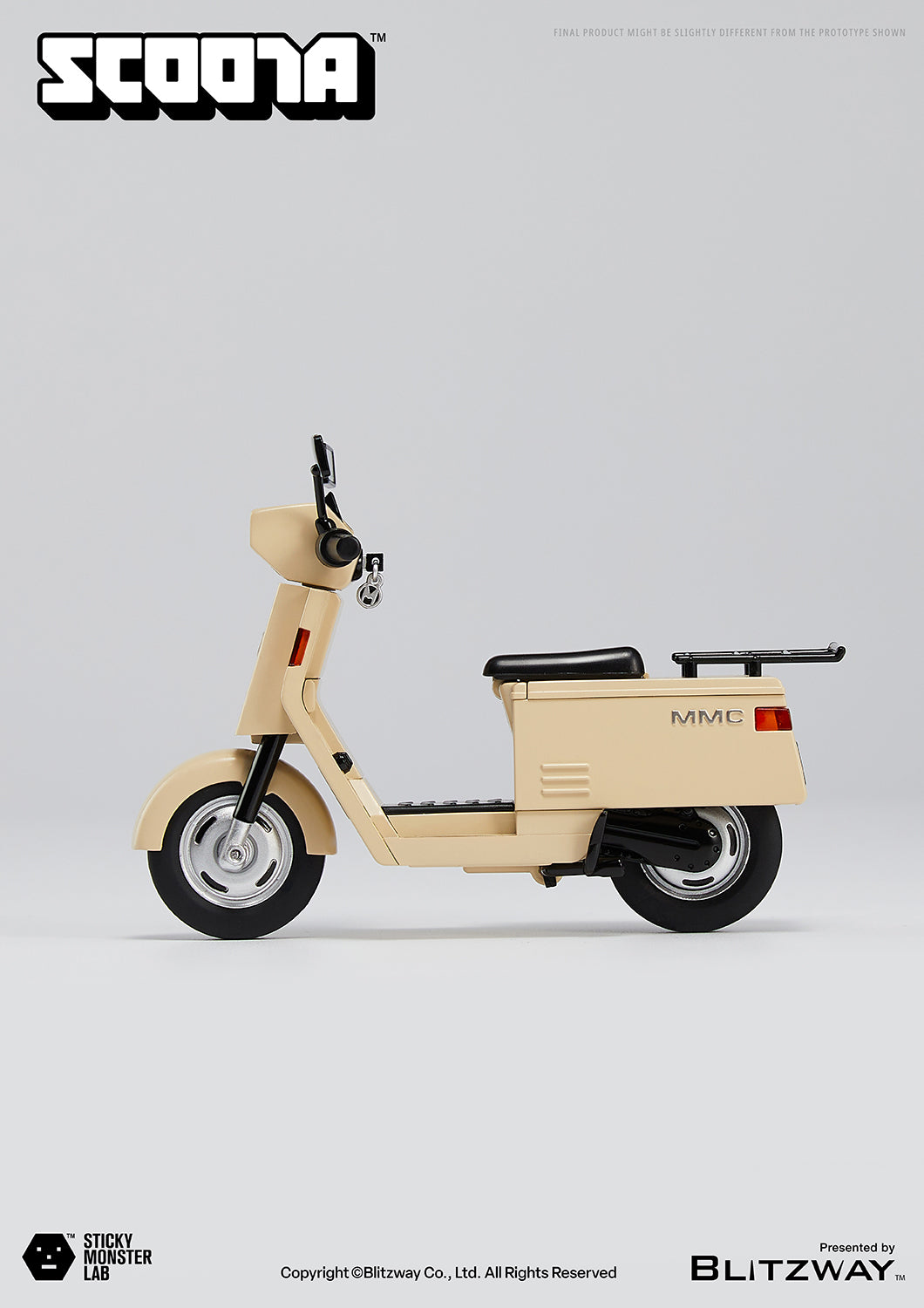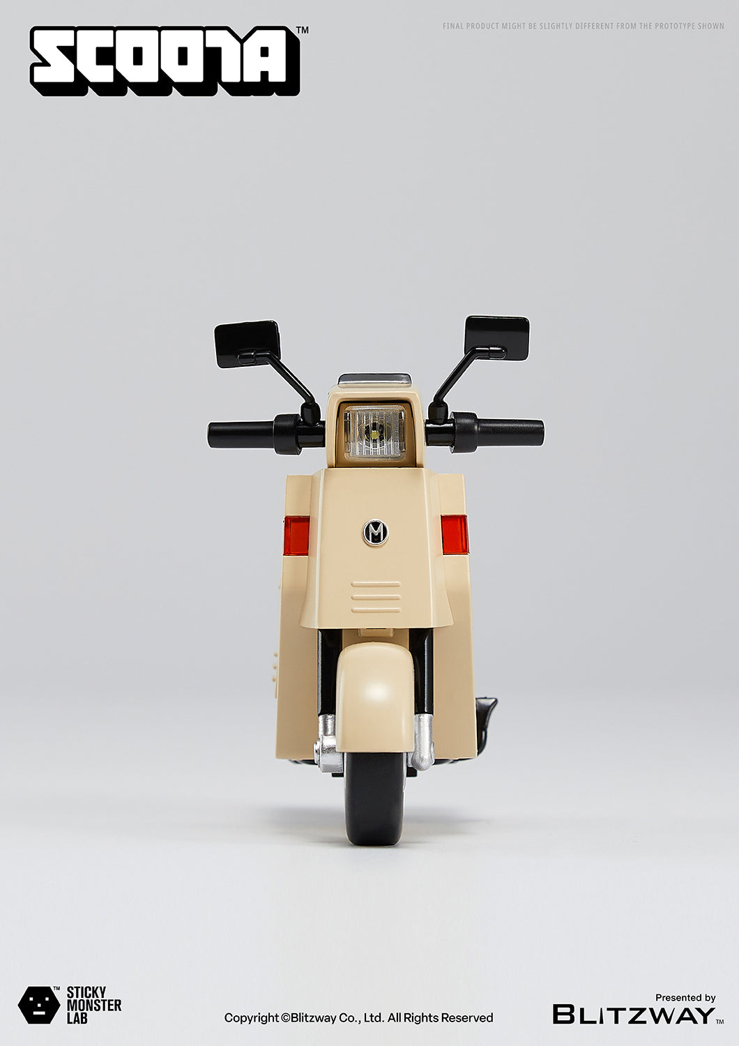 A beige scooter exuding retro vibes, fitting the monster’s blue training suit. LED lights adorn both front and rear, complementing the steering handles. Detailed working wheels and a kickstand allow for a realistic scooter experience.
