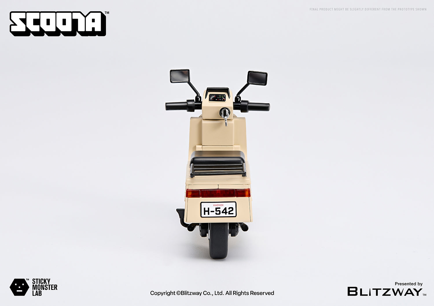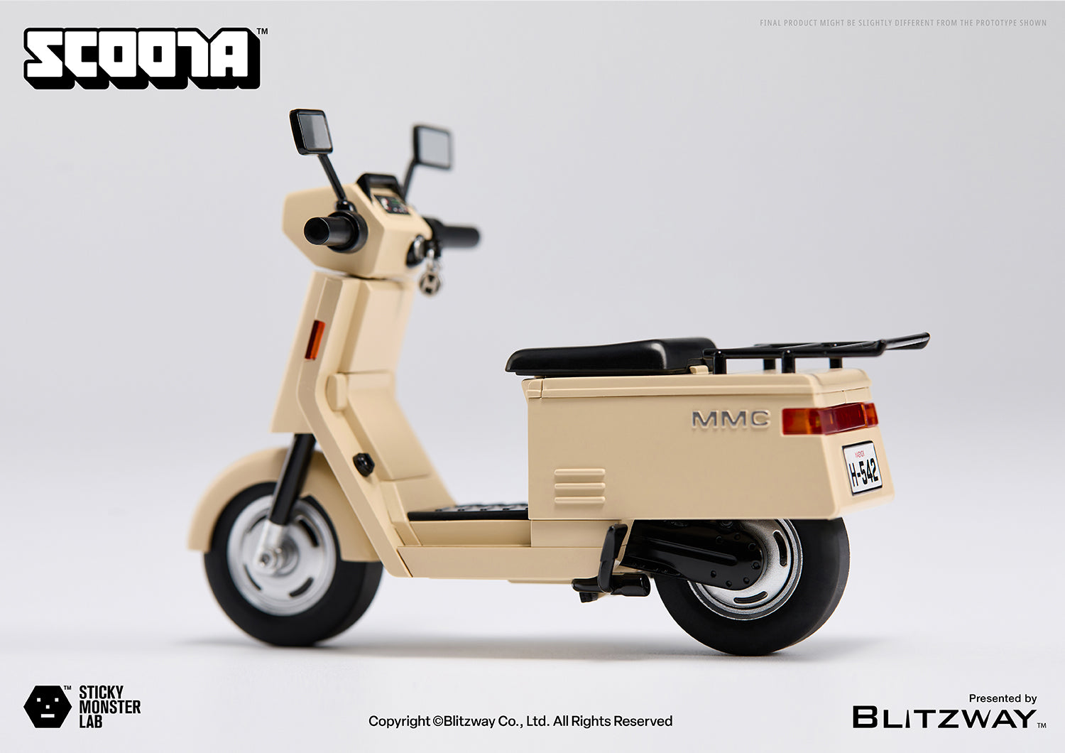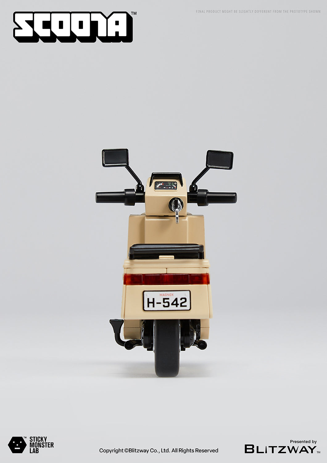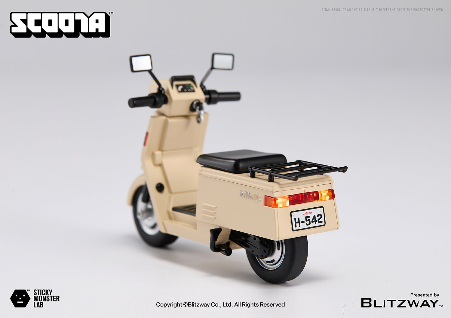 A beige scooter exuding retro vibes, fitting the monster’s blue training suit. LED lights adorn both front and rear, complementing the steering handles. Detailed working wheels and a kickstand allow for a realistic scooter experience.
