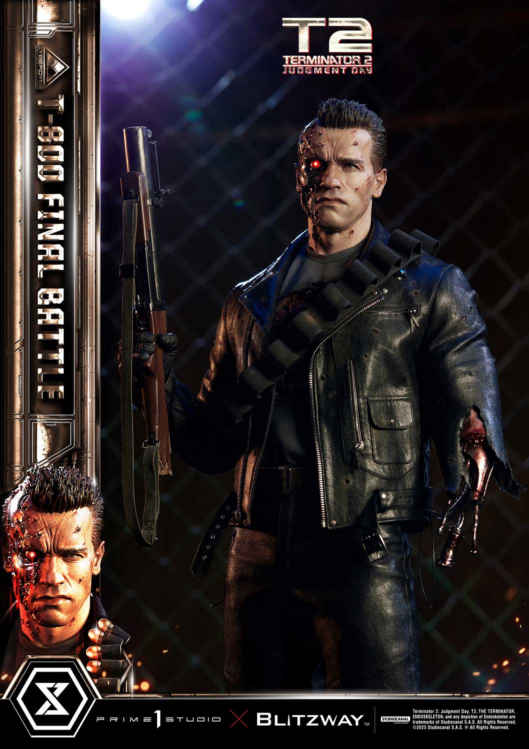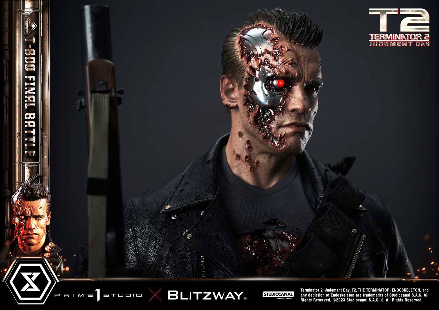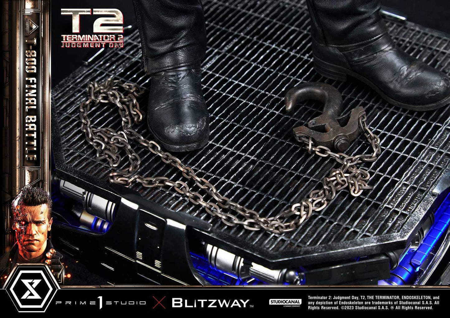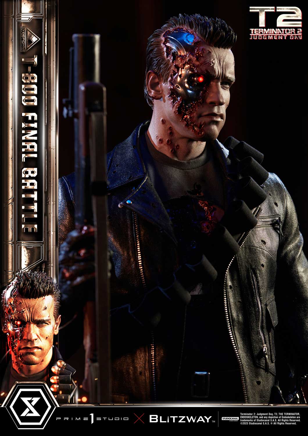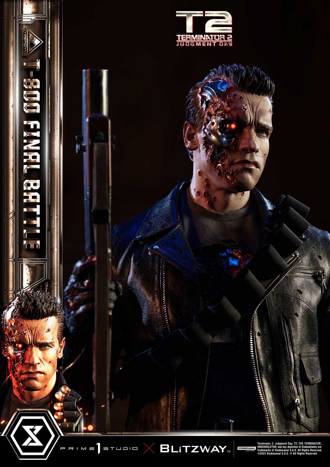 This time, we are taking you back to the climax of the movie, the final battle between T-800 and T-1000 at the steel mill, bringing you a hyper-realistic screen-accurate depiction of a battle-damaged T-800. As usual, Blitzway masterfully sculpted this 29-inch-tall work of art. The fierce battle against the new and improved T-1000 has caused substantial damage to the protagonist. Once again, breath-taking craftsmanship to recreate T-800 in all his menacing splendor from the final act: ripped flesh, revealing the endoskeleton underneath as well as the built-in LED illuminated right eye. Every aspect and detail of the outfit has been meticulously and masterfully replicated. Genuine black leather has been used to recreate the Terminator’s outfit with masterful attention to detail. We are talking bullet holes, zippers, pockets, and buckles on the stunning biker jacket, accessorized with a textile cartridge belt. Torn pant-leg showing a glimpse of the exposed endo-leg underneath. Two right-arm parts allow you to display either the grenade launcher or the rod used to sever his left arm that got trapped in a set of heavy gears during the intense struggle with Skynet’s assassin. T-800 Final Battle stands atop a steel-factory-themed base that is also LED-illuminated. At his feet is a chain hoist hook as well as up to twelve scattered bullets.