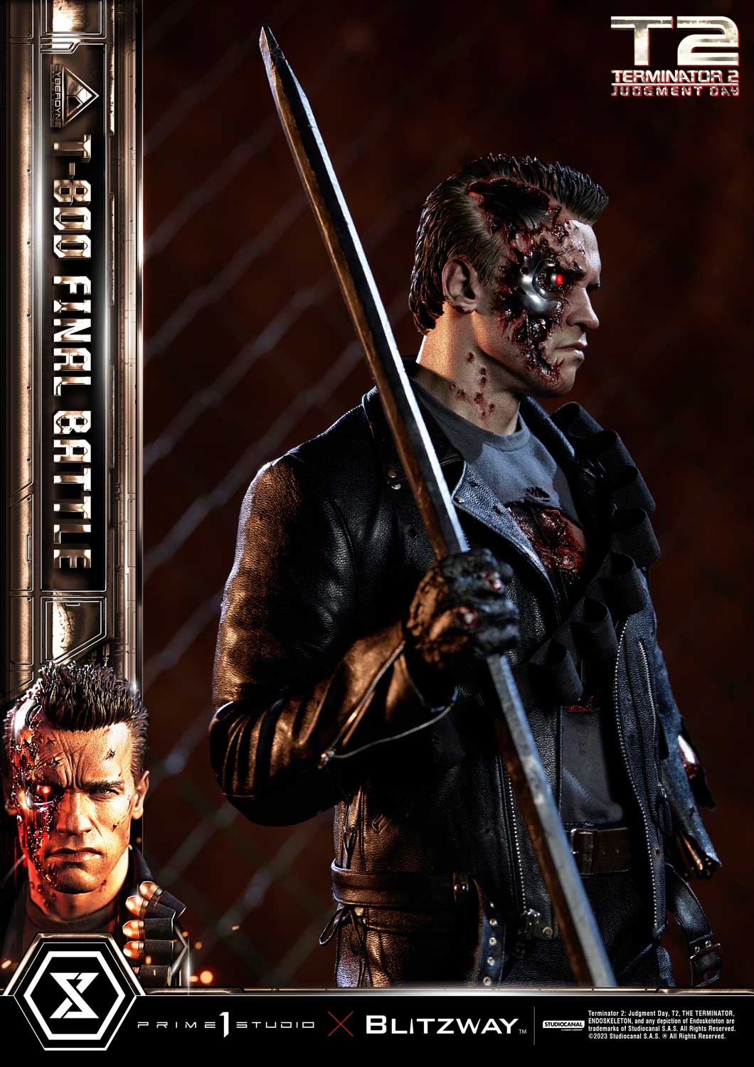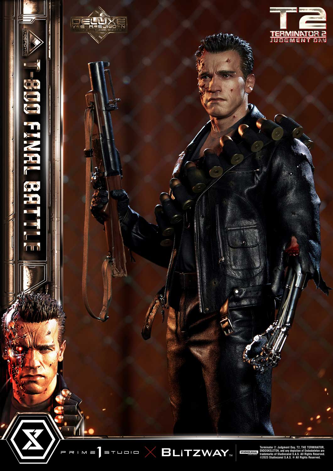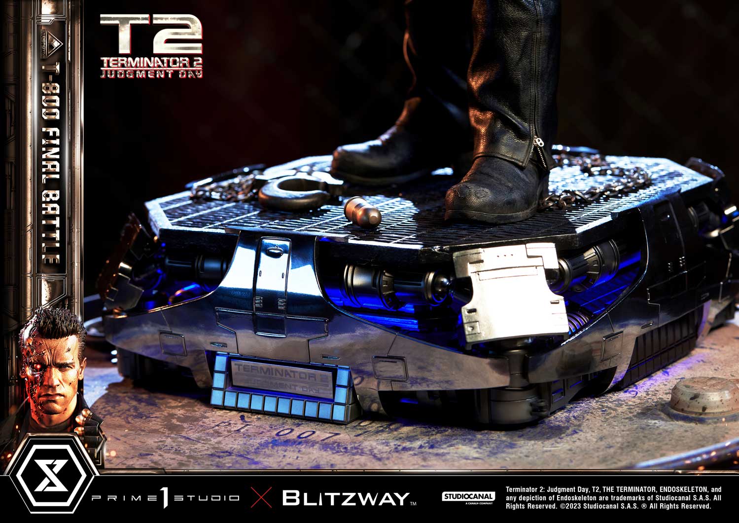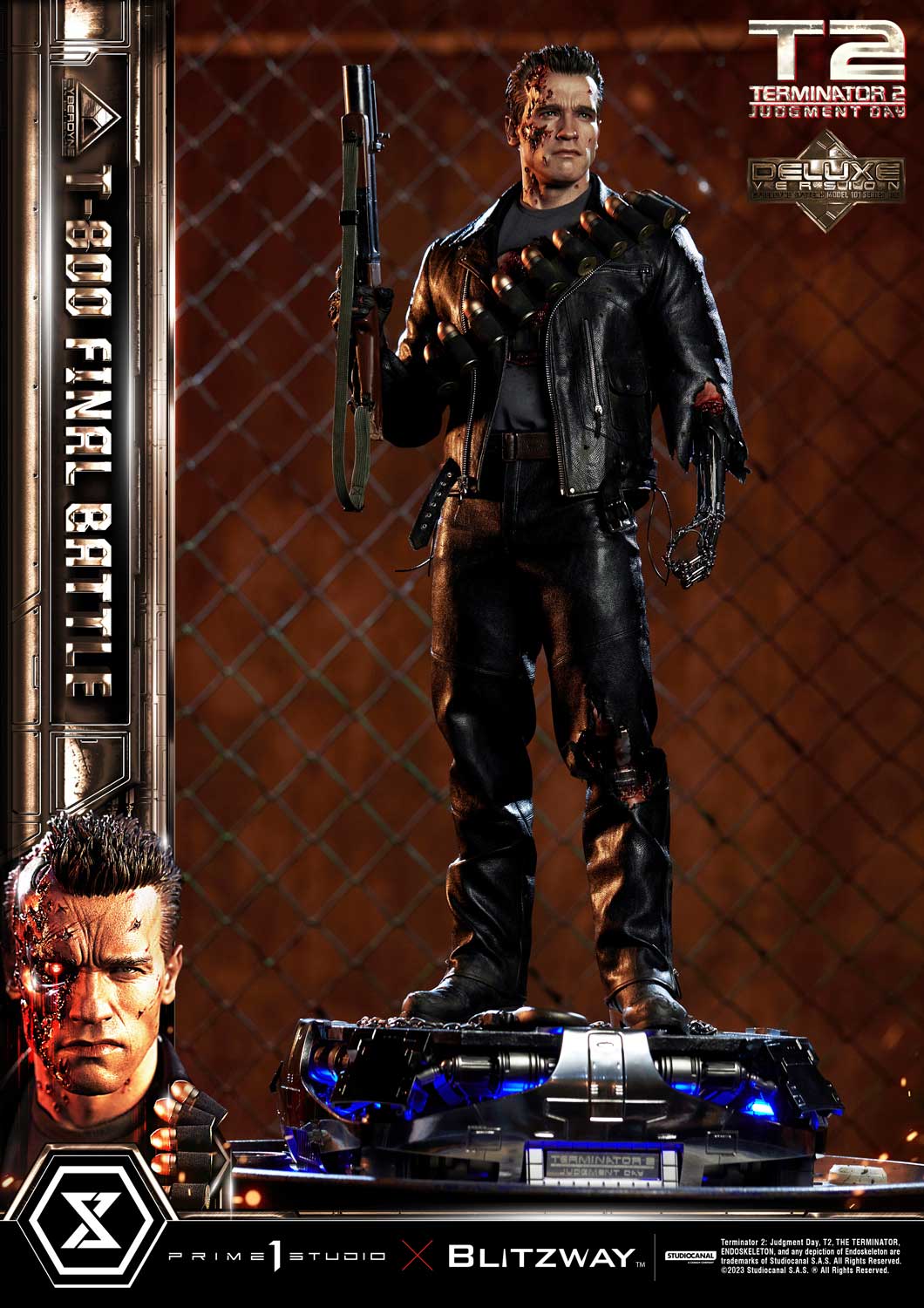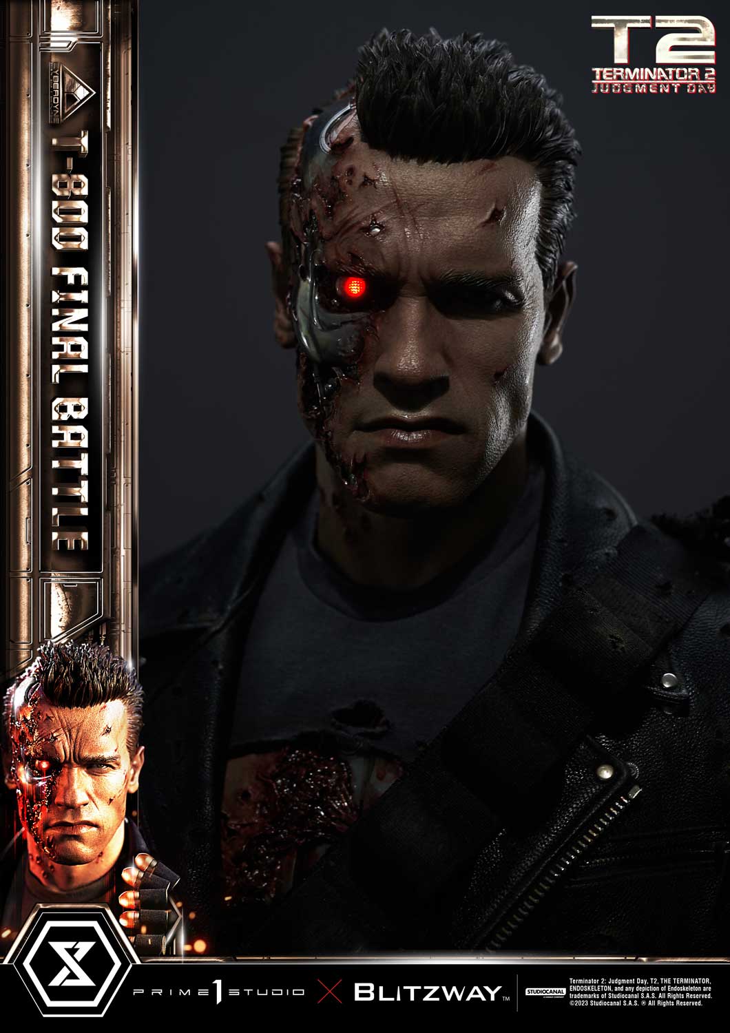 This time, we are taking you back to the climax of the movie, the final battle between T-800 and T-1000 at the steel mill, bringing you a hyper-realistic screen-accurate depiction of a battle-damaged T-800. As usual, Blitzway masterfully sculpted this 29-inch-tall work of art. The fierce battle against the new and improved T-1000 has caused substantial damage to the protagonist. Once again, breath-taking craftsmanship to recreate T-800 in all his menacing splendor from the final act: ripped flesh, revealing the endoskeleton underneath as well as the built-in LED illuminated right eye. Every aspect and detail of the outfit has been meticulously and masterfully replicated. Genuine black leather has been used to recreate the Terminator’s outfit with masterful attention to detail. We are talking bullet holes, zippers, pockets, and buckles on the stunning biker jacket, accessorized with a textile cartridge belt. Torn pant-leg showing a glimpse of the exposed endo-leg underneath. Two right-arm parts allow you to display either the grenade launcher or the rod used to sever his left arm that got trapped in a set of heavy gears during the intense struggle with Skynet’s assassin. T-800 Final Battle stands atop a steel-factory-themed base that is also LED-illuminated. At his feet is a chain hoist hook as well as up to twelve scattered bullets.