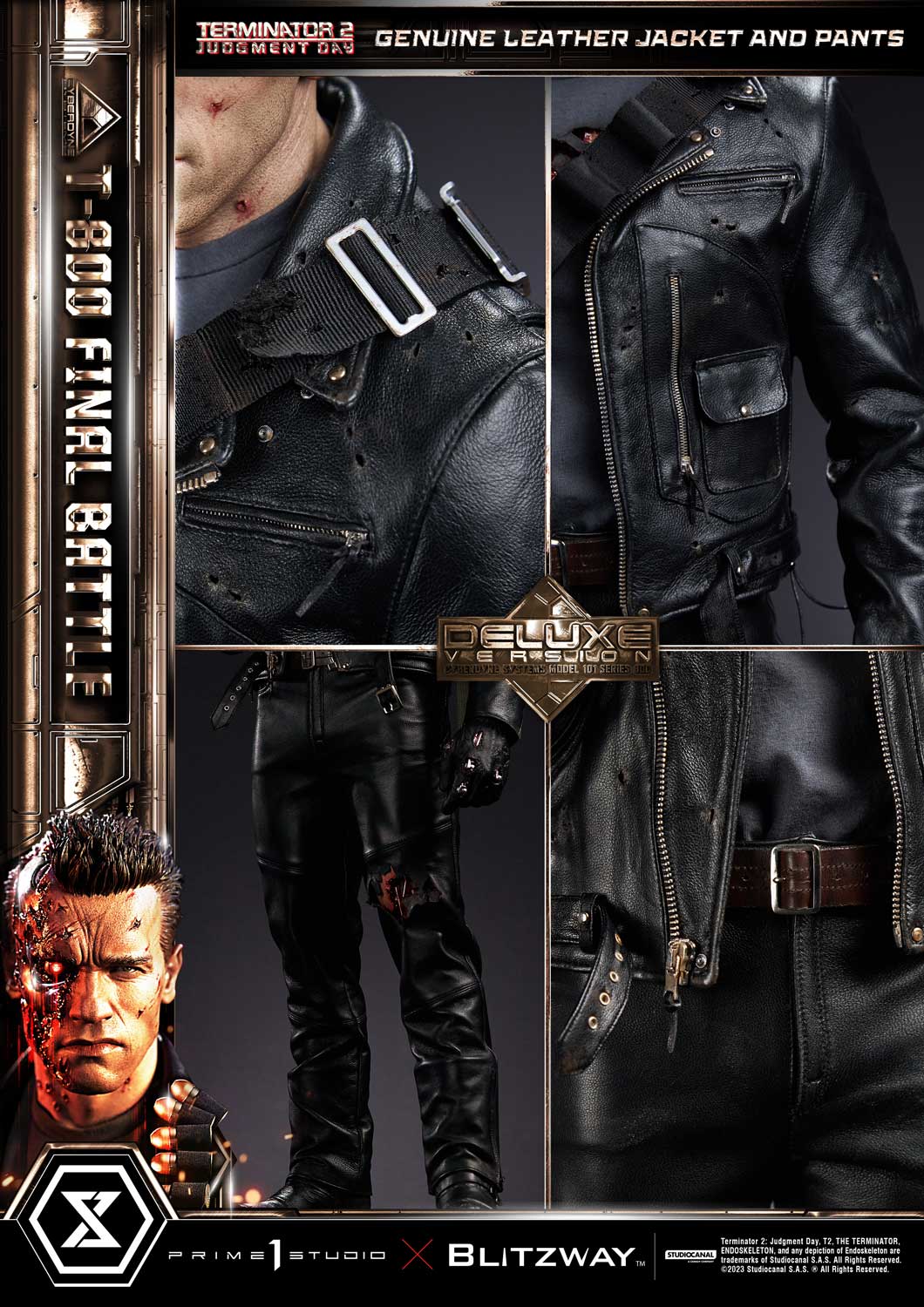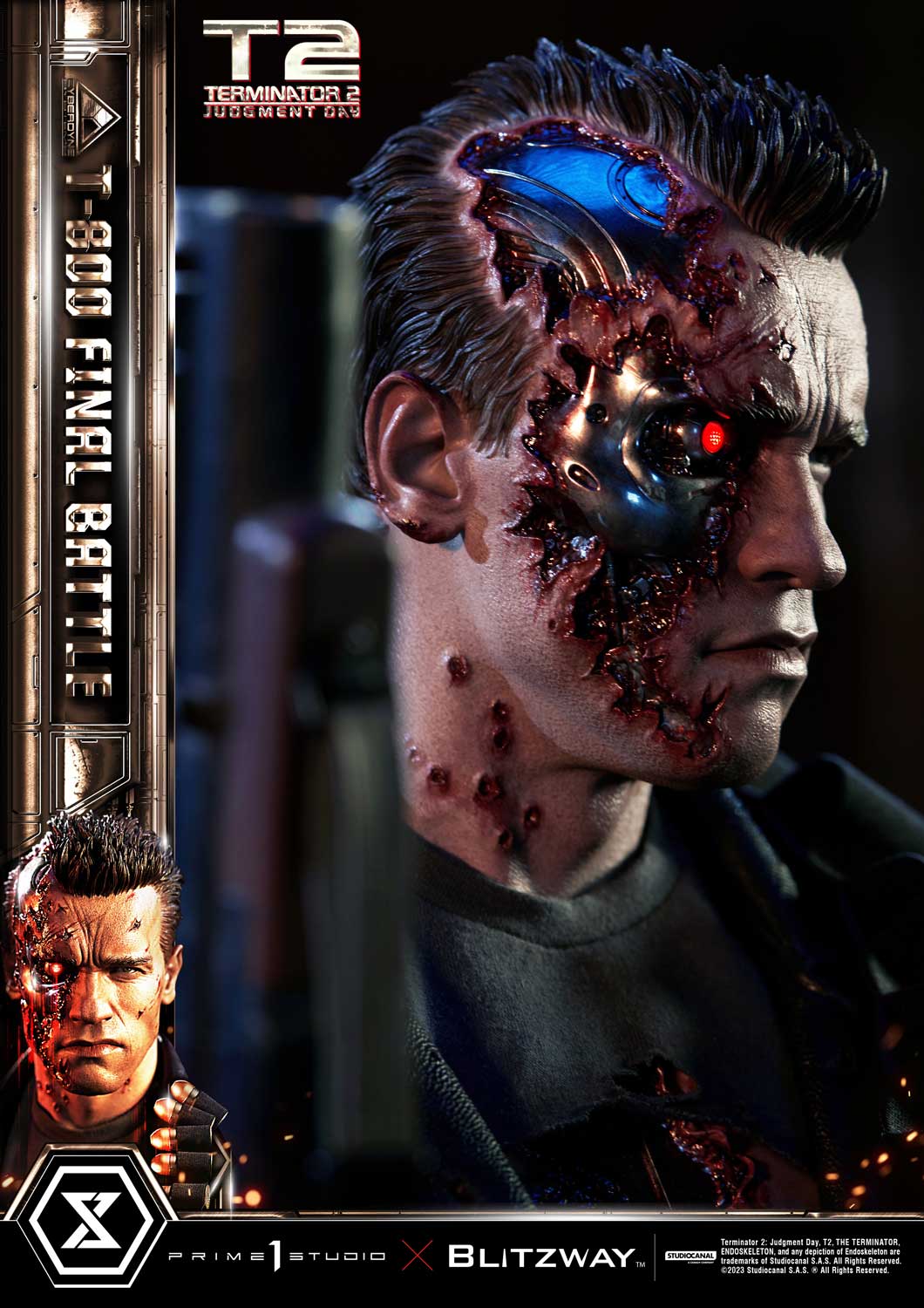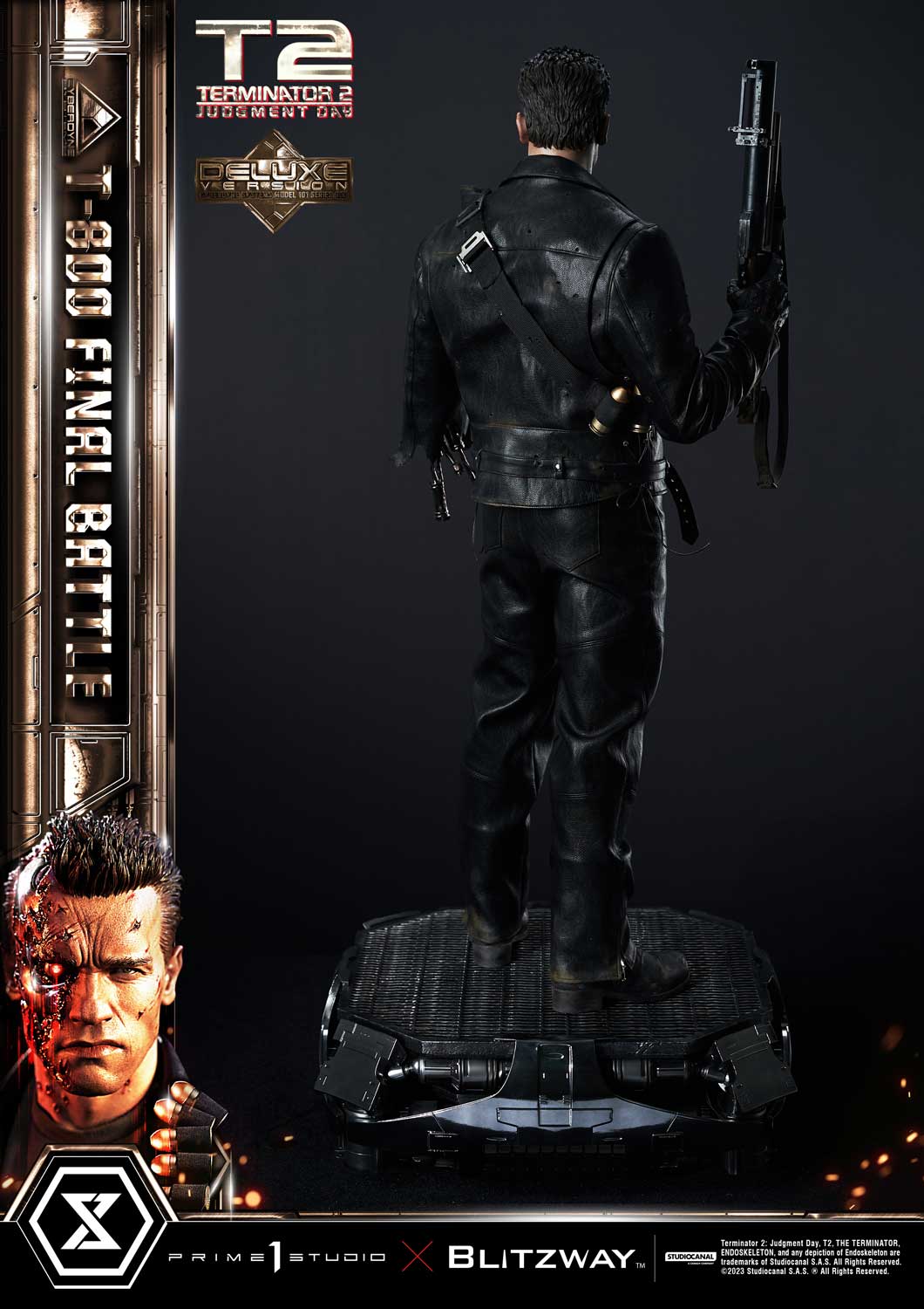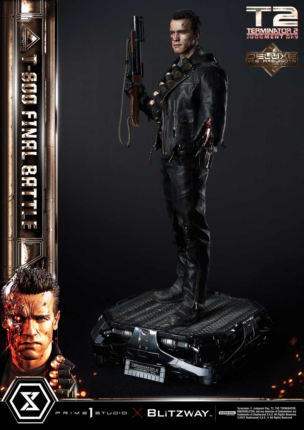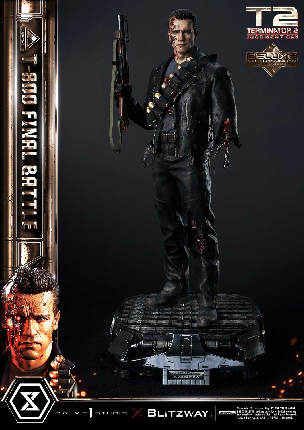 This time, we are taking you back to the climax of the movie, the final battle between T-800 and T-1000 at the steel mill, bringing you a hyper-realistic screen-accurate depiction of a battle-damaged T-800. As usual, Blitzway masterfully sculpted this 29-inch-tall work of art. The fierce battle against the new and improved T-1000 has caused substantial damage to the protagonist. Once again, breath-taking craftsmanship to recreate T-800 in all his menacing splendor from the final act: ripped flesh, revealing the endoskeleton underneath as well as the built-in LED illuminated right eye. Every aspect and detail of the outfit has been meticulously and masterfully replicated. Genuine black leather has been used to recreate the Terminator’s outfit with masterful attention to detail. We are talking bullet holes, zippers, pockets, and buckles on the stunning biker jacket, accessorized with a textile cartridge belt. Torn pant-leg showing a glimpse of the exposed endo-leg underneath. Two right-arm parts allow you to display either the grenade launcher or the rod used to sever his left arm that got trapped in a set of heavy gears during the intense struggle with Skynet’s assassin. T-800 Final Battle stands atop a steel-factory-themed base that is also LED-illuminated. At his feet is a chain hoist hook as well as up to twelve scattered bullets.
