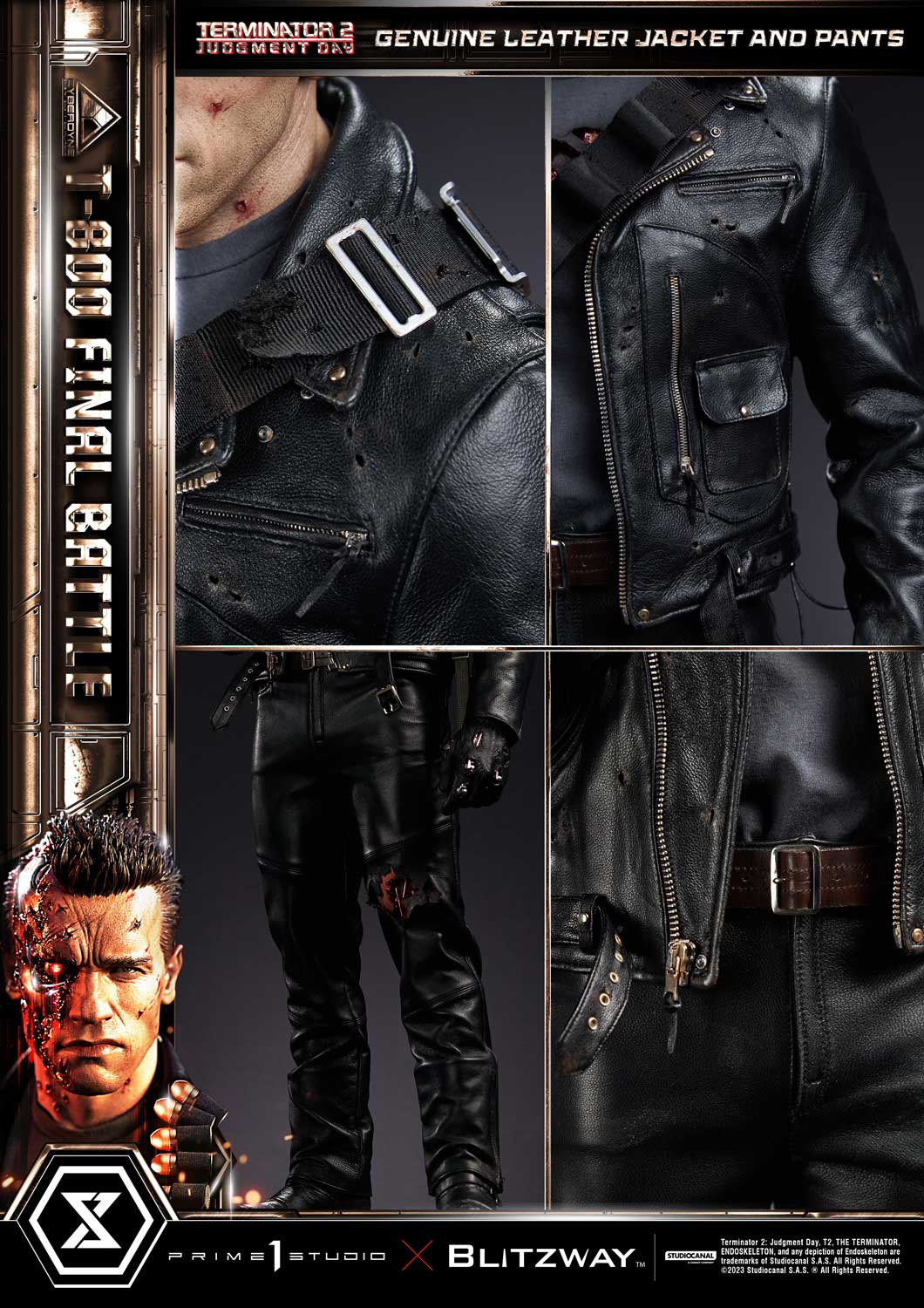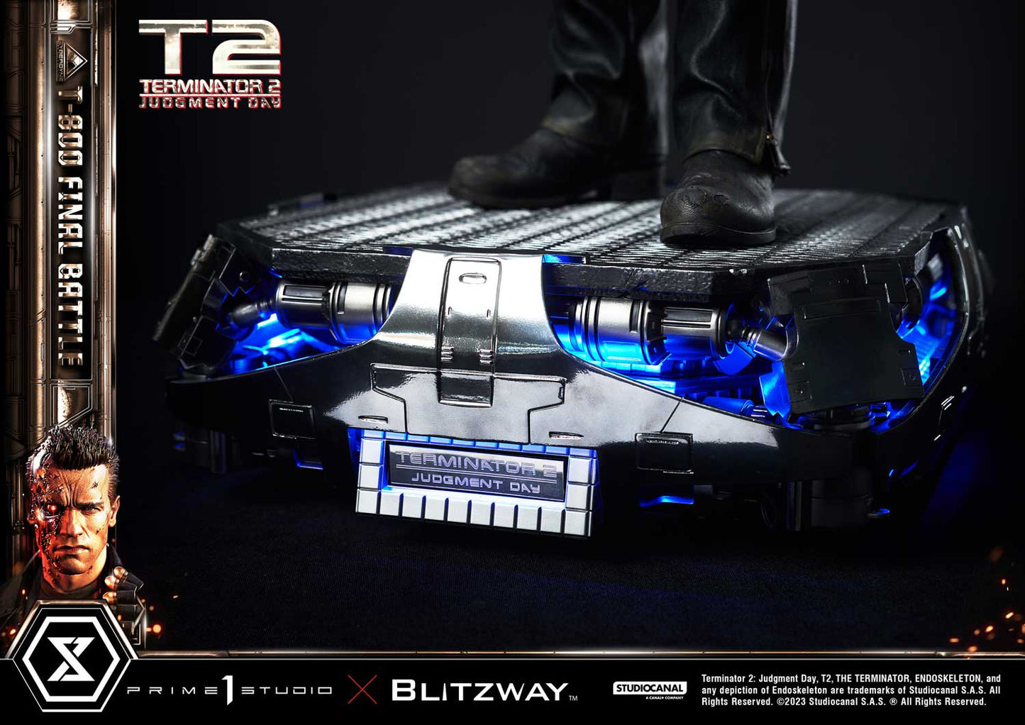 This time, we are taking you back to the climax of the movie, the final battle between T-800 and T-1000 at the steel mill, bringing you a hyper-realistic screen-accurate depiction of a battle-damaged T-800. As usual, Blitzway masterfully sculpted this 29-inch-tall work of art. The fierce battle against the new and improved T-1000 has caused substantial damage to the protagonist. Once again, breath-taking craftsmanship to recreate T-800 in all his menacing splendor from the final act: ripped flesh, revealing the endoskeleton underneath as well as the built-in LED illuminated right eye. Every aspect and detail of the outfit has been meticulously and masterfully replicated. Genuine black leather has been used to recreate the Terminator’s outfit with masterful attention to detail. We are talking bullet holes, zippers, pockets, and buckles on the stunning biker jacket, accessorized with a textile cartridge belt. Torn pant-leg showing a glimpse of the exposed endo-leg underneath. Two right-arm parts allow you to display either the grenade launcher or the rod used to sever his left arm that got trapped in a set of heavy gears during the intense struggle with Skynet’s assassin. T-800 Final Battle stands atop a steel-factory-themed base that is also LED-illuminated. At his feet is a chain hoist hook as well as up to six scattered grenade launcher bullets.
