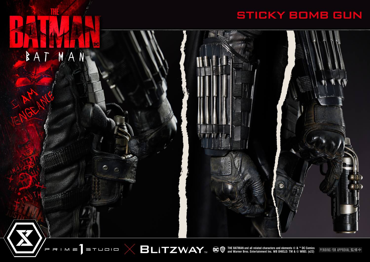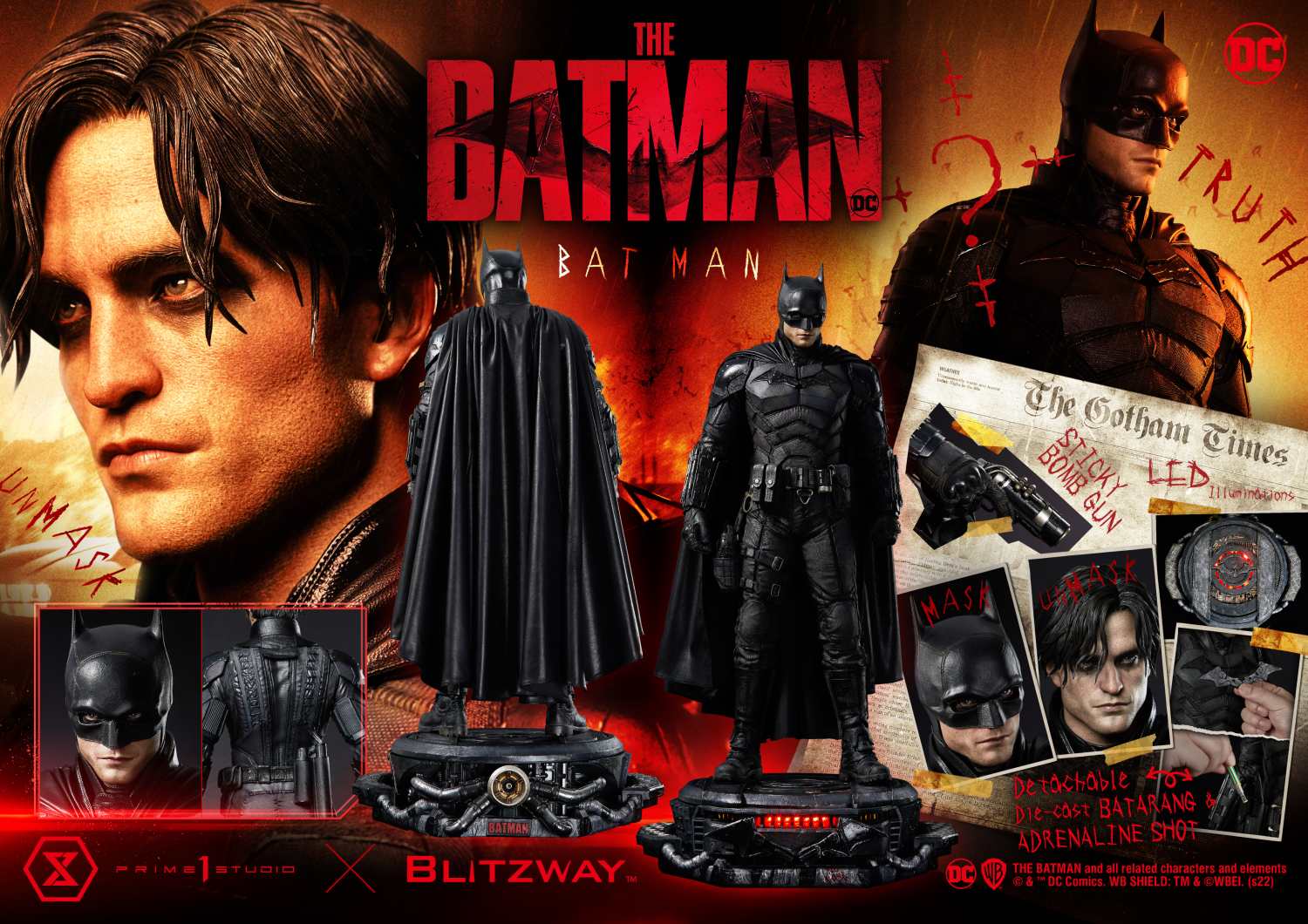 The statue comes with a multitude of impressive features: two (2) swappable heads (cowled and unmasked), three (3) swappable right hands, two (2) interactive Utility Belt Pouches with removable Adrenaline Syringes, detachable die-cast Batarang on the chest, removable Sticky Bomb Gun from the holster, and a fabric cape with the visual weight of a full-sized version!